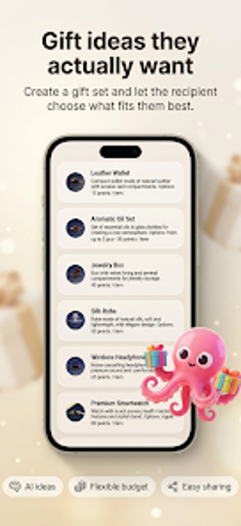 قوائم هدايا غيفتوبس الذكية هو تطبيق مجاني لنظام أندرويد مصمم لتبسيط عملية تقديم الهدايا. يتيح للمستخدمين إنشاء مجموعات هدايا مخصصة تتناسب مع تفضيلات المستلم، مما يضمن أن تكون الهدايا مدروسة ومقدّرة. يحتوي التطبيق على مولد هدايا بالذكاء الاصطناعي، مما يمكّن المستخدمين من وصف عمر المستلم واهتماماته والمناسبة، ثم يقوم تلقائيًا بإنشاء قائمة بأفكار الهدايا المناسبة. يمكن للمستخدمين أيضًا إضافة أفكار يدويًا وتحديد ميزانية باستخدام نظام نقاط مرن، مما يسهل إدارة الهدايا الجماعية والمناسبات الخاصة.